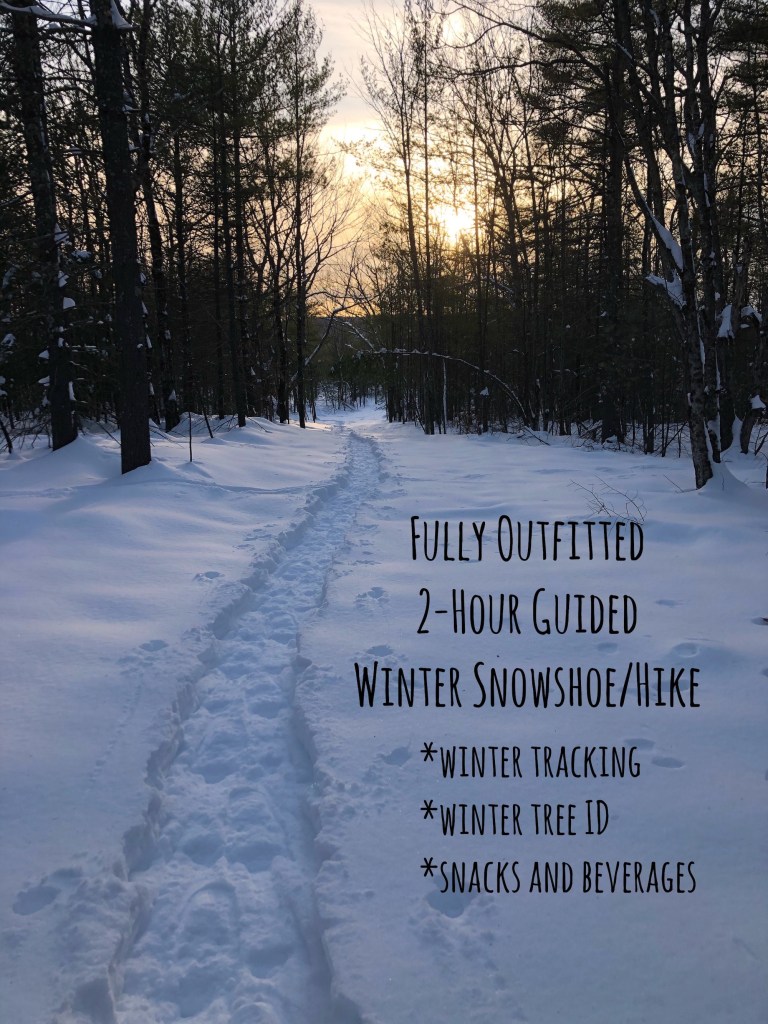 Give an experience as a gift this holiday season! We are offering gift certificates for a fully outfitted 2-hour winter snowshoeing/hiking adventure! The trip includes use of snowshoes (if you don’t have your own), winter tracking, winter tree ID, snacks and beverages.